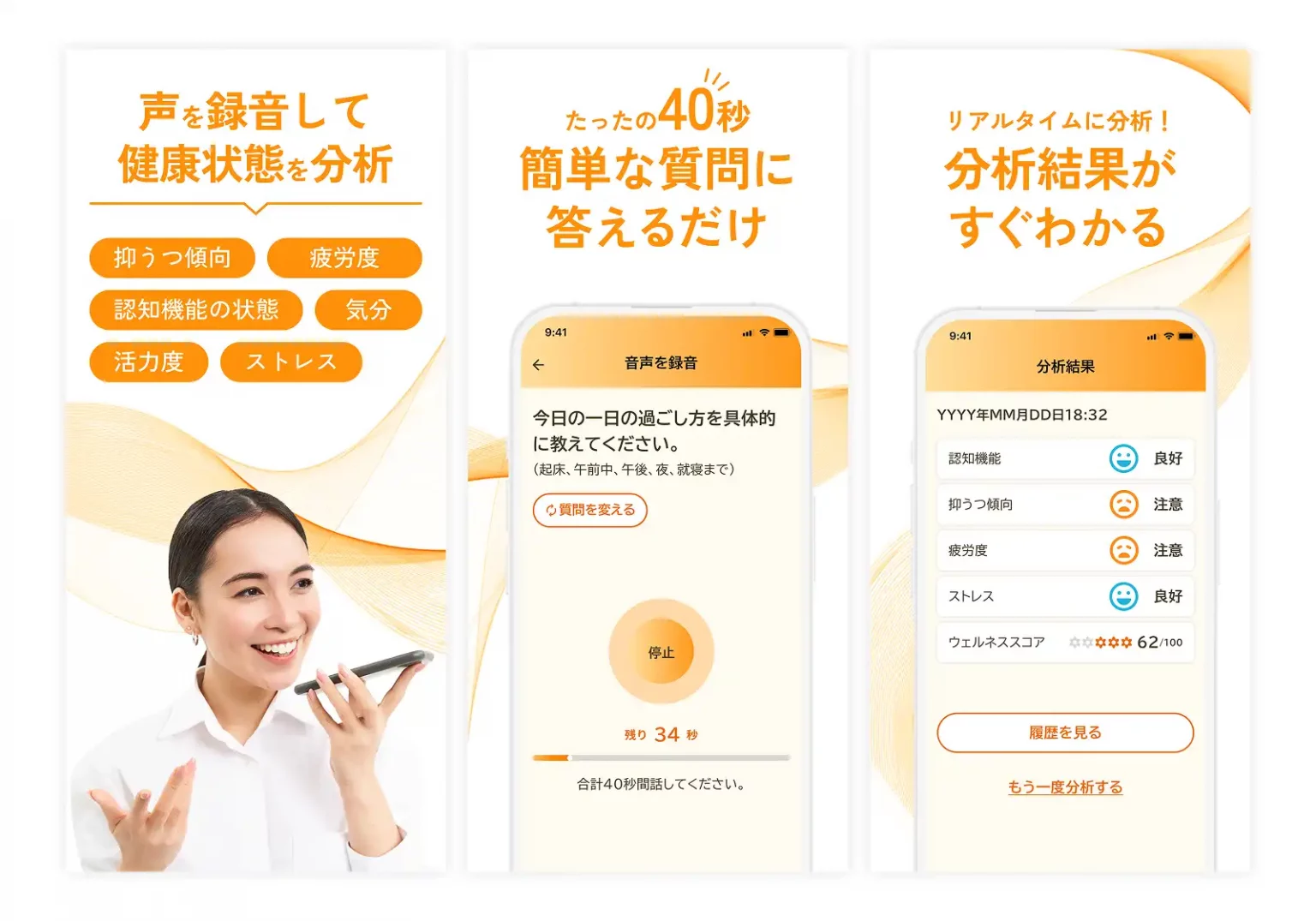 【まちづくりDX / ヘルスケアDX開発事例】録音された音声から認知機能の状態や抑うつ傾向、疲労度などの健康状態を分析できるモバイルヘルスケアアプリの開発において、ユーザーアプリ、サーバサイド、データベースの開発、UI/UXデザインを担当しました。大きな社会課題である認知症やうつ病や簡易的に早期発見できる技術として、今後大きなポテンシャルが見込まれます。