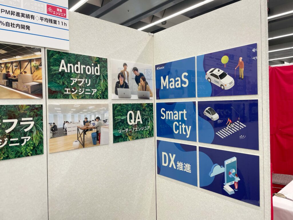 ソニックスは「MaaS」「Smart City」「DX推進」の3事業を主軸とし、モビリティソリューションといえばソニックス、といっていただけるよう日々事業に取り組んでおります。市場の急成長と事業の拡大に伴い、現在の社員80名から150名へ「社員倍増計画」として2021年より新卒採用、中途採用ともに力を入れています。 前回の参加で着席数トップタイを記録、嬉しい悲鳴を上げた弊社ですが、2回目である今回はさらに多くの方にブースに来訪いただき、大盛況のうちに終えることが出来ました。当日の様子を写真つきでご紹介します。